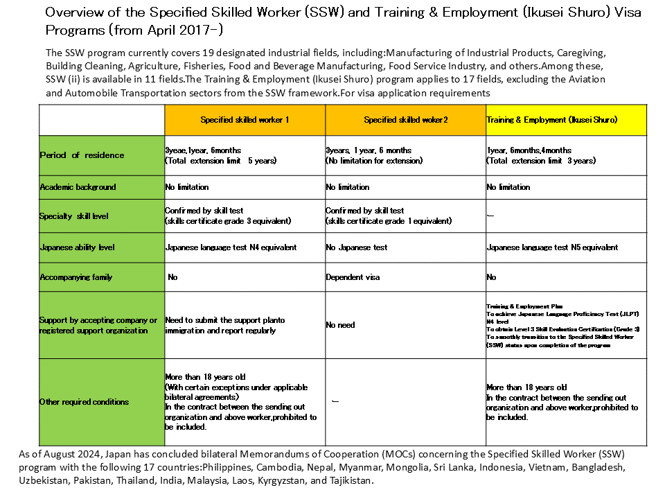 | Specified Skilled Worker Visa,Training and Employment Visa(Ikusei Shuro) |